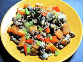 This is a mix of minced beef, celery, sweet potato, capsicum and mushrooms.