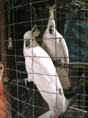 6. went to Altona to buy spoons + saw two very beautiful cockatoos <Bloody Hell!! Their house is very cool and full of heaps of "shits"! (The hostess has collected 2 cabinets of Frogs) Oh, and with two Cockatoos + several tanks of fish.... Crazy but very interesting!!>